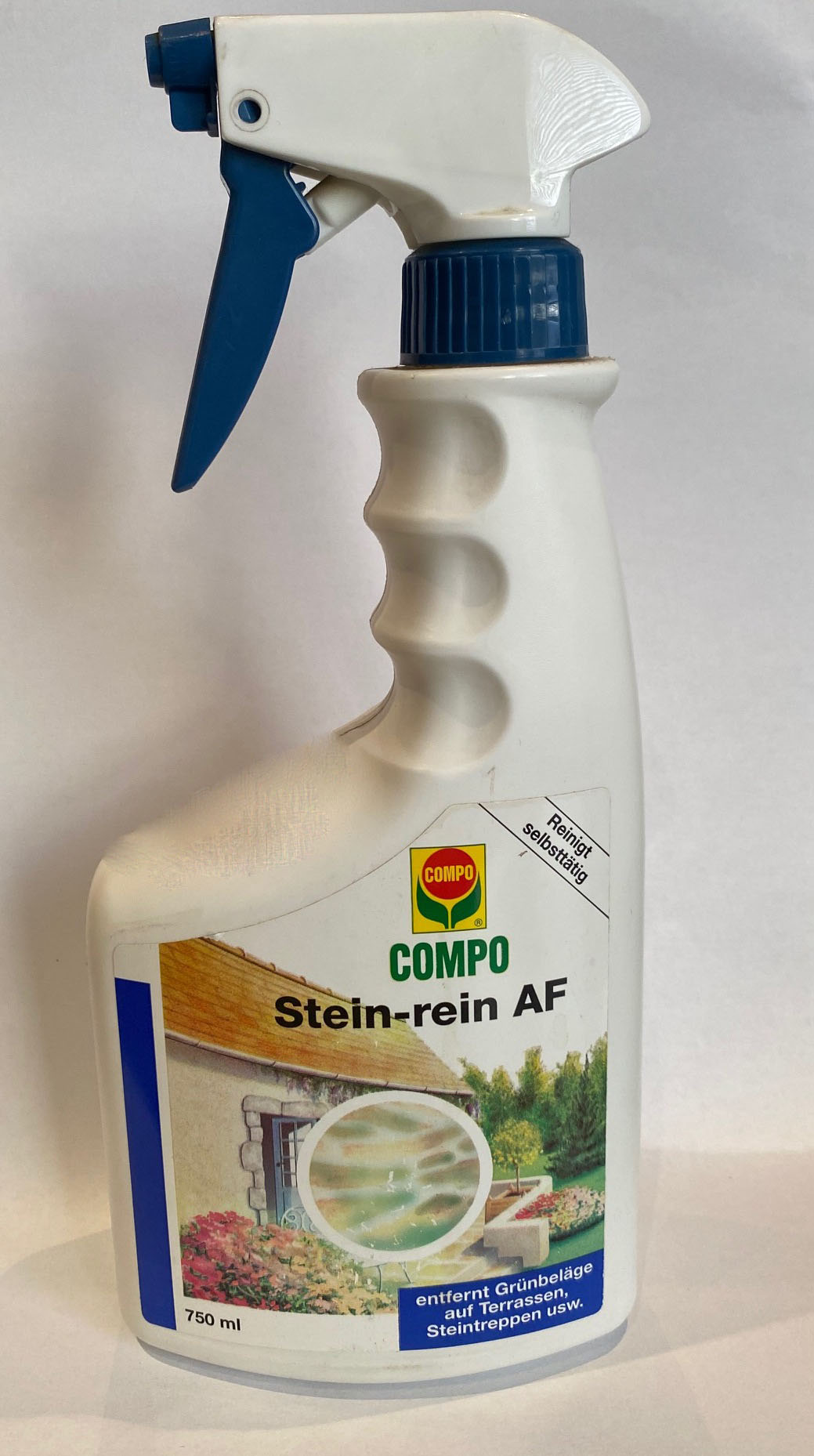 Hochwirksames, anwendungsfertiges Reinigungsmittel zur Beseitigung von Grünbelägen und anderen Verschmutzungen auf Steinplatten, Betonflächen, Grabsteinen, Holzteilen, Natursteinen, Terrakotta, Glasflächen, usw.