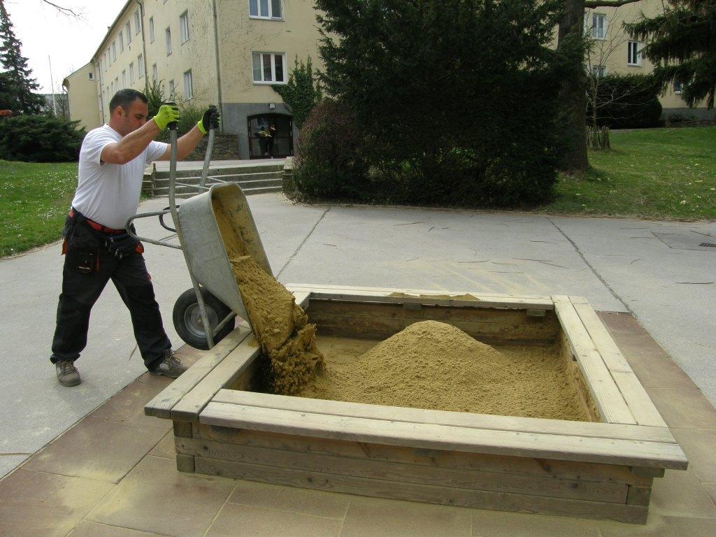 Der alte, unhygienisch gewordene Spielsand wird abgegraben, abtransportiert sowie fachgerecht entsorgt. Danach wird neuer, geprüfter Spielsand geliefert, der Sandspielplatz bzw. der Sandkasten befüllt und eingeebnet.