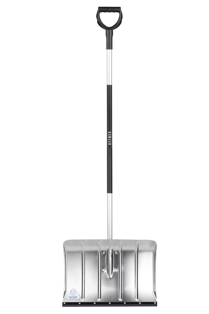Aluminium-Schneeschieber, mit widerstandsfähiger Gummikante, rippenverstärktes Blatt, gerader Alu-Sitel und Kunsstoff D-Griff, montiert